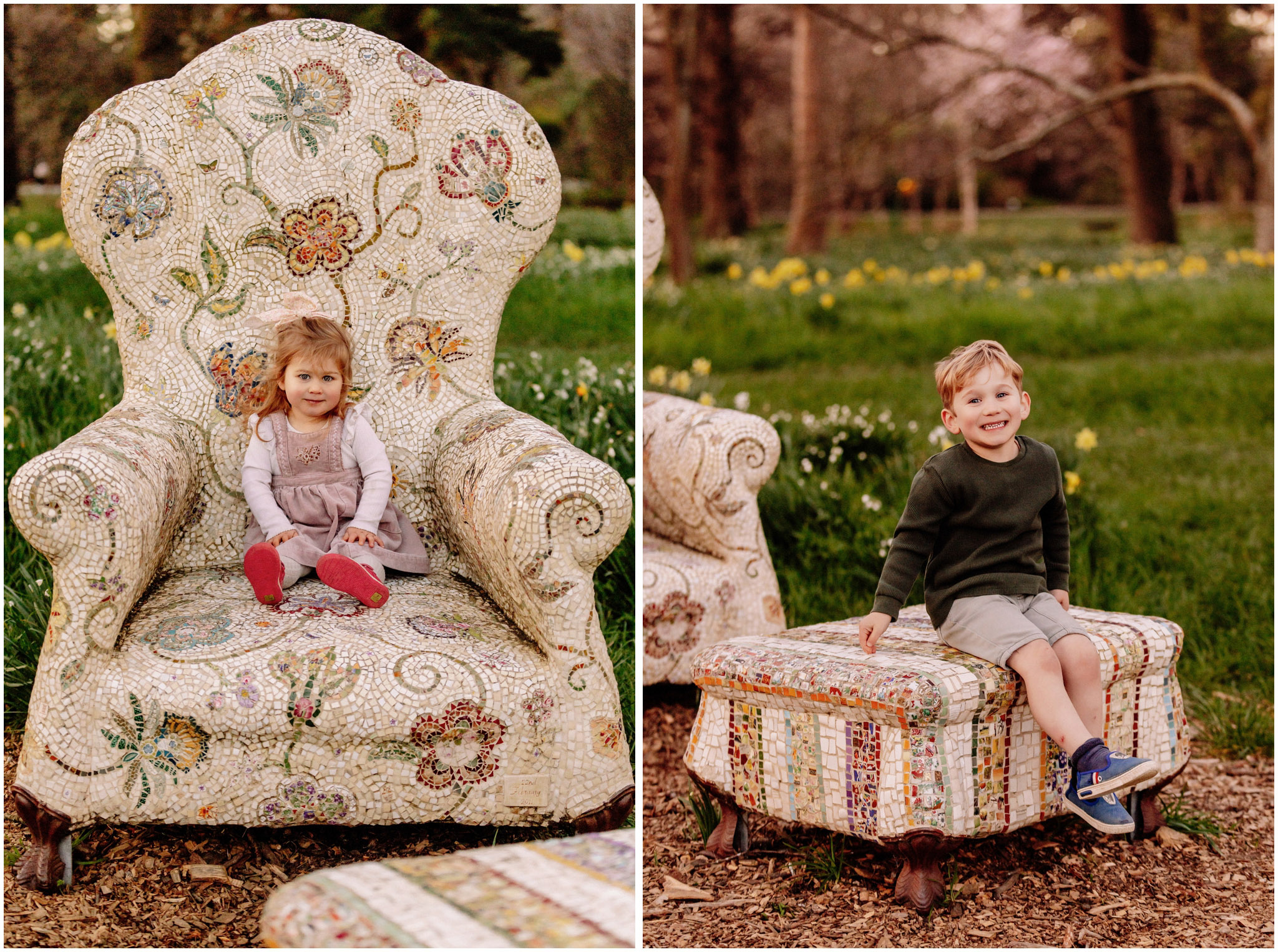 On the way back to the car we detoured to the great big mosaic armchair. It’s impossible not to climb it. The kids took turns choosing the “throne” with Bella dubbing herself “Queen Bella” and Jamie “King Jamie.” It was such a simple outing, but that’s the magic for me – no rush, no pressure, just being together. These are the kinds of memories I want to capture for families.