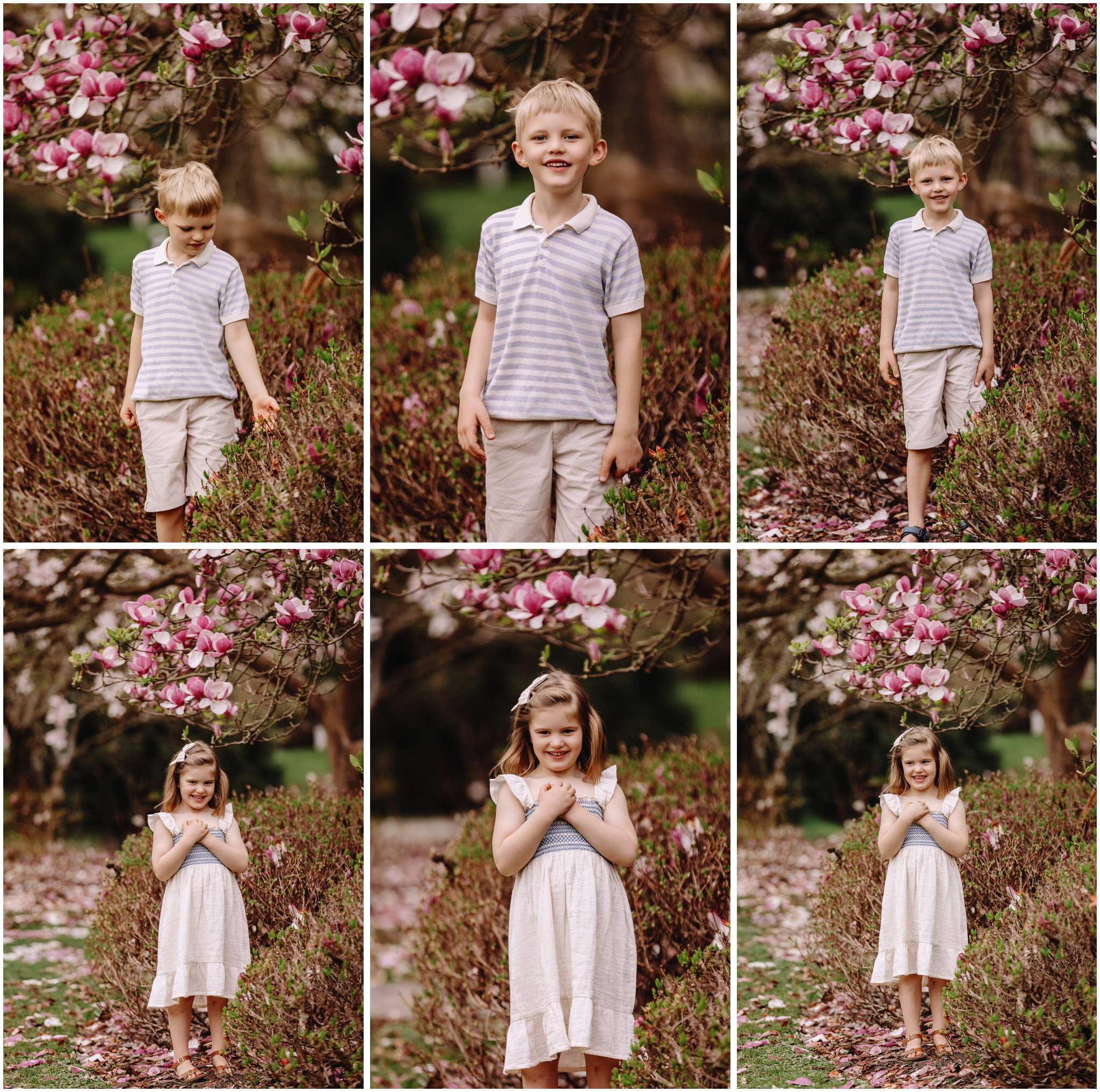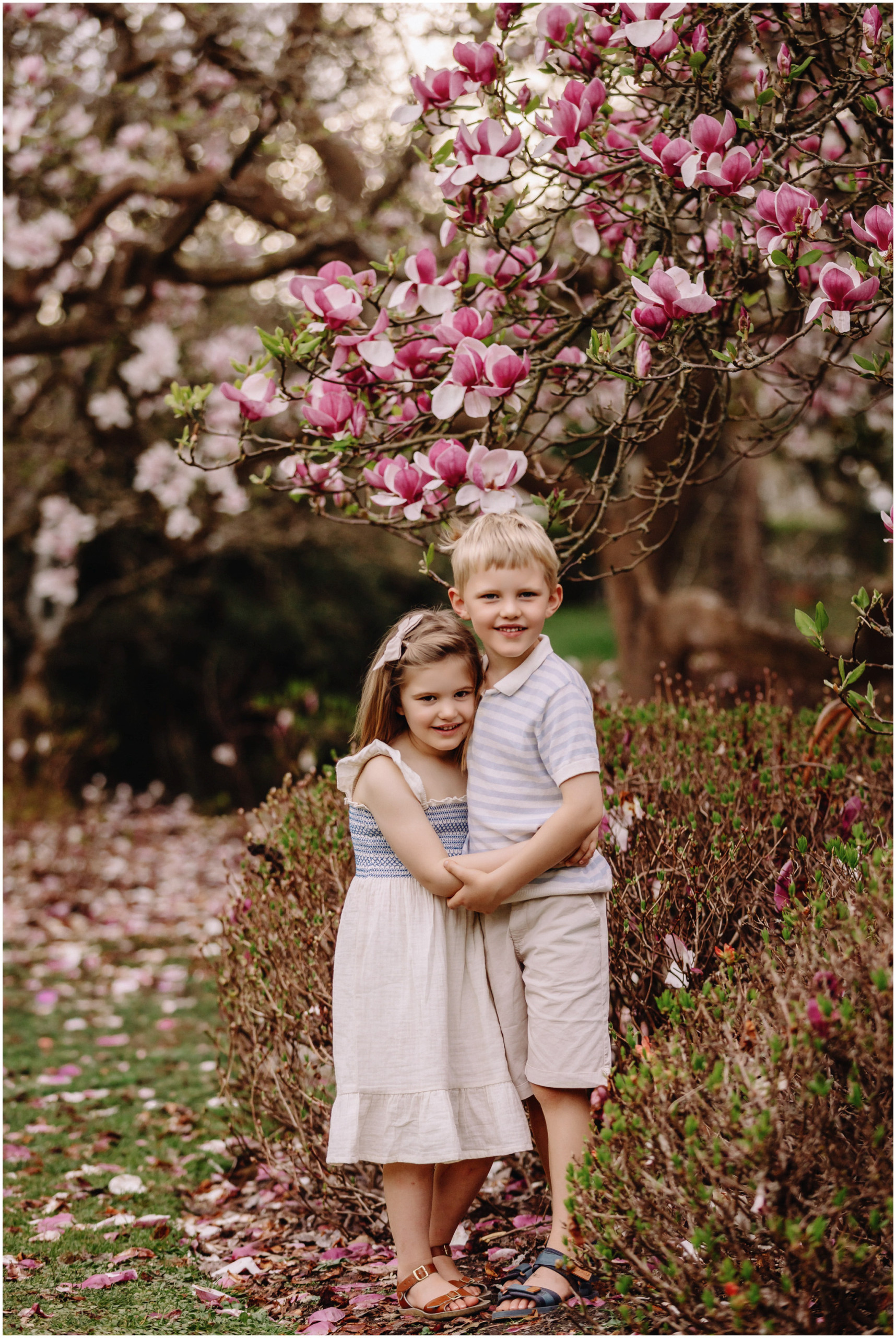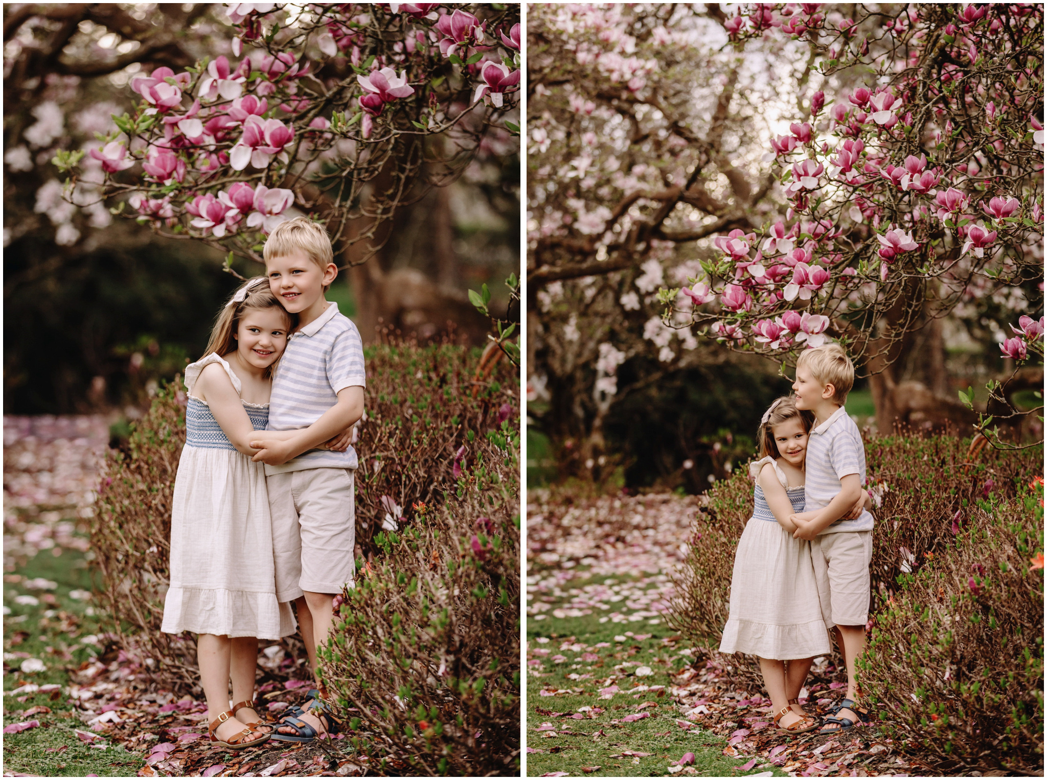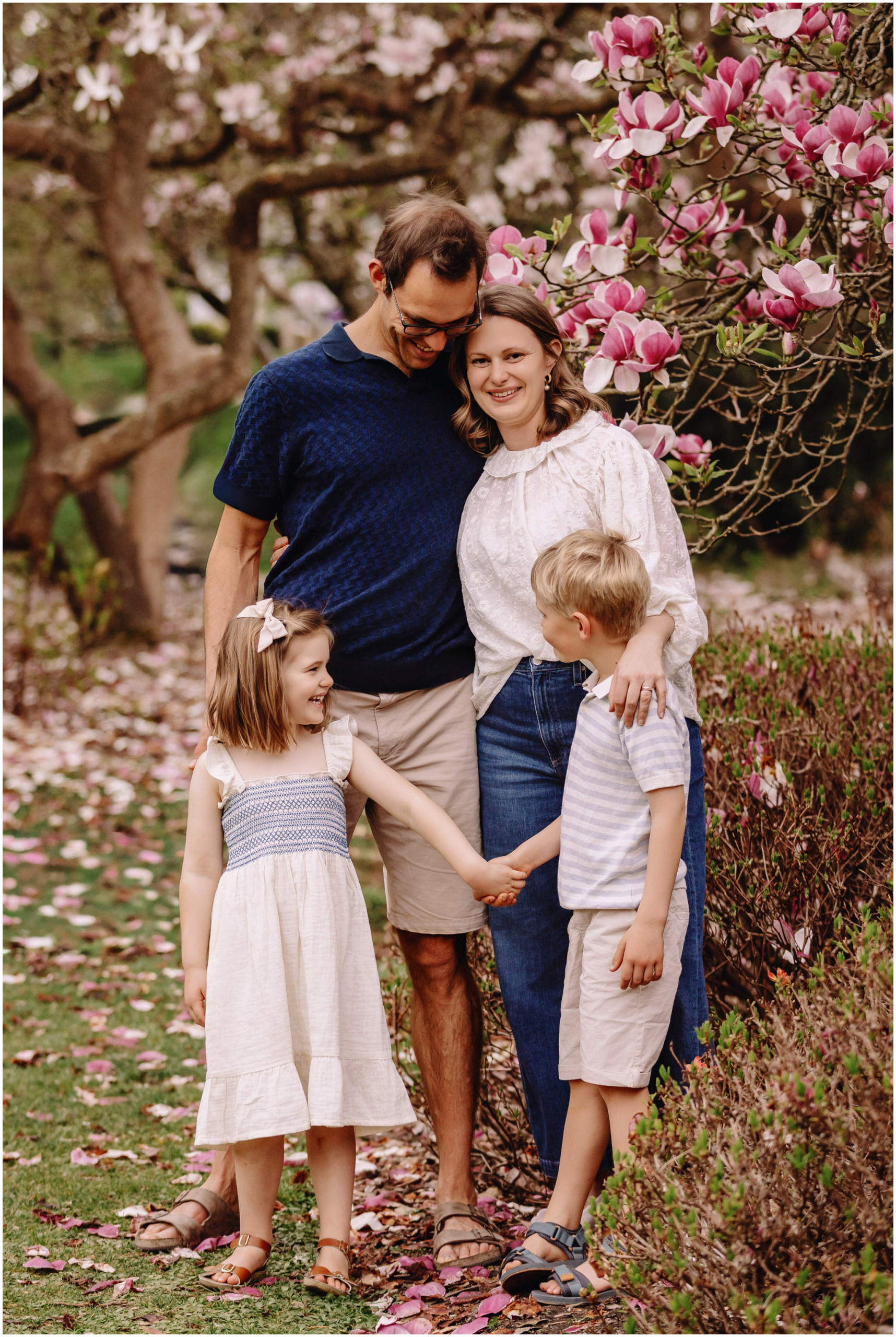 Keeping things fun is a big part of my approach to family photos. Kids are happiest when they can move and explore, so there was plenty of laughing, running, and those cheeky little looks we know so well. We wandered through the magnolia gardens next, where the colours were showing off perfectly, and stopped for a mix of cosy portraits and spontaneous silliness.